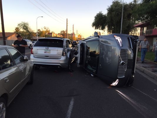 Het ongeluk vond in de nacht van vrijdag op zaterdag plaats in de stad Tempe, in het Amerikaanse Arizona. Volgens de politie gaf de bestuurder van de andere auto geen voorrang aan de Uber-Volvo terwijl die dat wel had moeten krijgen. De botsing was het gevolg. Het feit dat de auto op zijn kant ligt, doet vermoeden dat een of beide auto’s met hoge snelheid door de stad reden. Desalniettemin is niemand zwaargewond geraakt, volgens Uber.